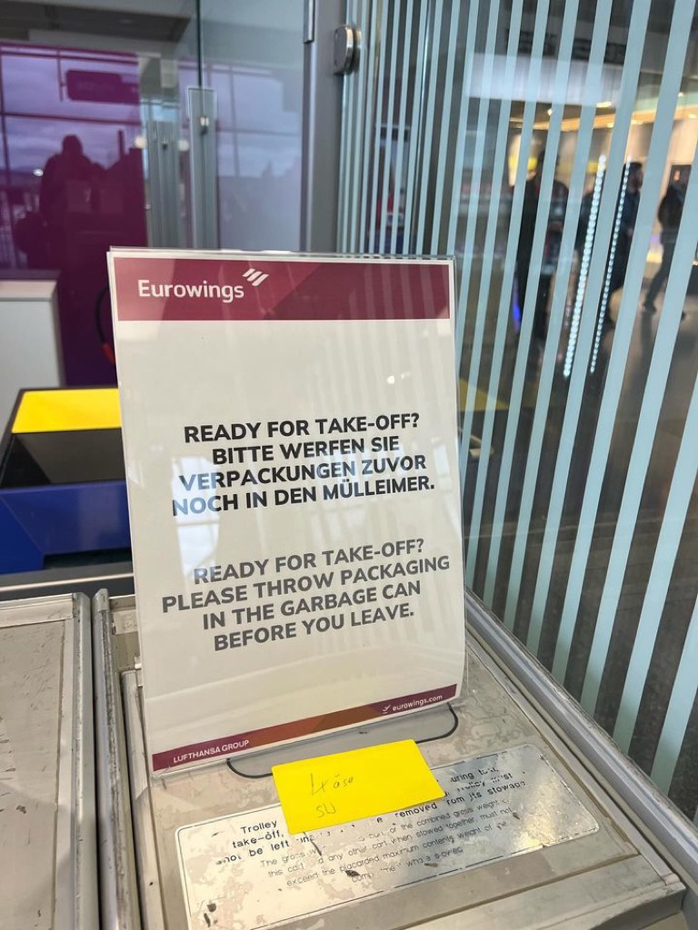 3. Bei den Sandwiches handelt es sich um die auch an Bord bei Eurowings ausgeteilte TK-Ware. Dazu gibt es aber noch einen Apfel oder eine Birne und einen Twix. Es ist kein Problem, sich auch ein zweites Sandwich geben zu lassen, aber man darf es sich aus unerfindlichen Gründen nicht selbst nehmen.