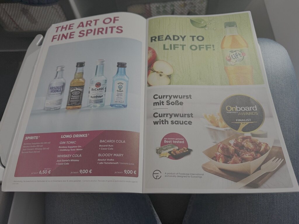 Es gibt kein In-Flight Entertainment, der am Sitz noch in der Kabine. Es lohnt sich, die Lieblingsserie oder den Lieblingsfilm auf dem Tablet oder Smartphone mitzubringen.
