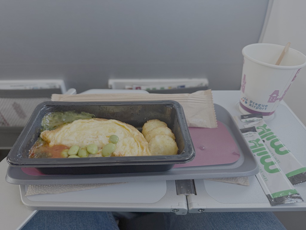 Nach dem Start wurde ein heißes Tuch gereicht. Anschließend wurde ein kleines Frühstück serviert. Zur Wahl standen Omlette oder Pancakes. Ich habe mich für das Omlette entschieden. Das schmeckte sehr viel besser als es aussah.