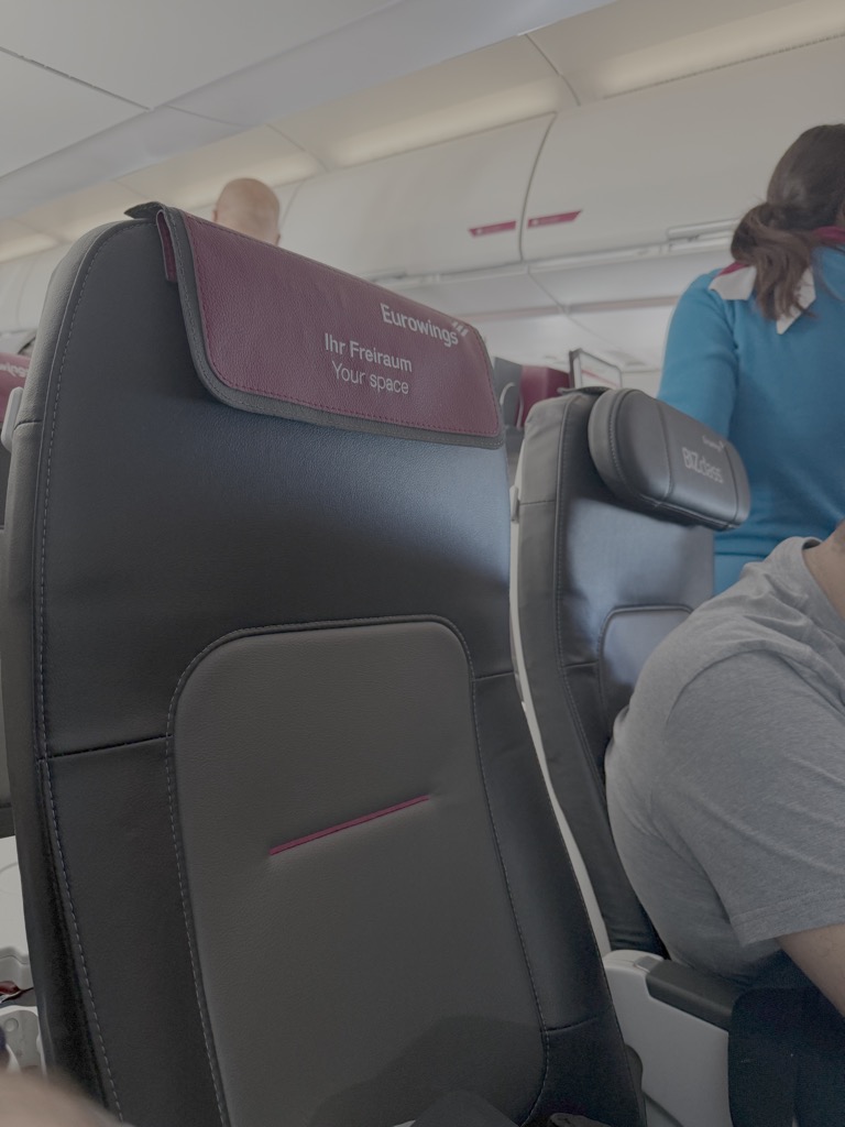 Auf diesem Flug verwendet Eurowings ein Kurz- und Mittelstreckenflugzeug, in diesem Fall eine A320neo. Das bedeutet eine 3-3 Bestuhlung.