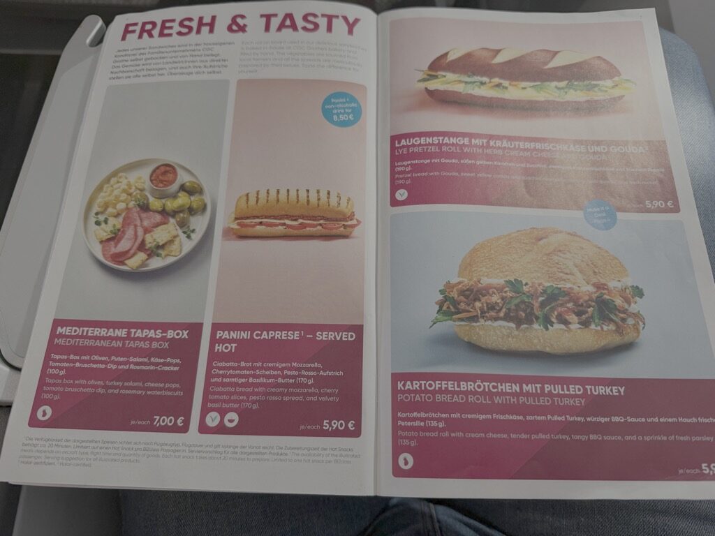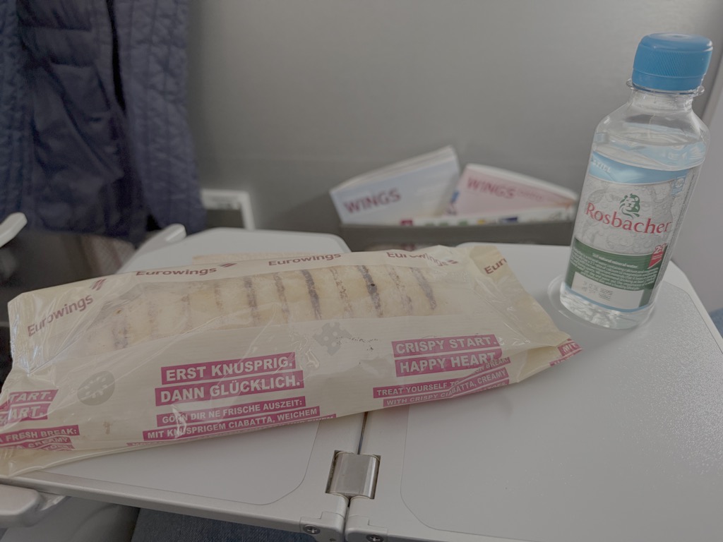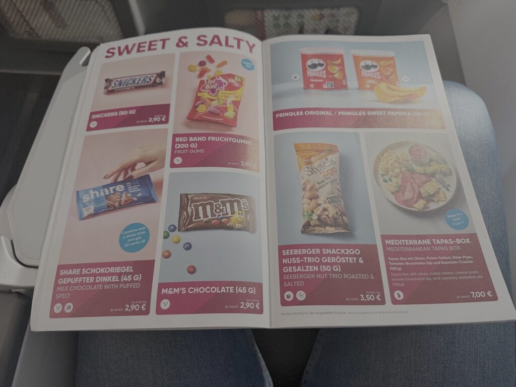 Dazu gab es Kaffee, Tee oder Wasser. Anschließend hat man die Möglichkeit aus sämtlichen Snacks und sämtlichen Getränken des Wings Bistros zu wählen. Die Auswahl ist überschaubar, aber für einen 6 Stunden Flug ausreichend.