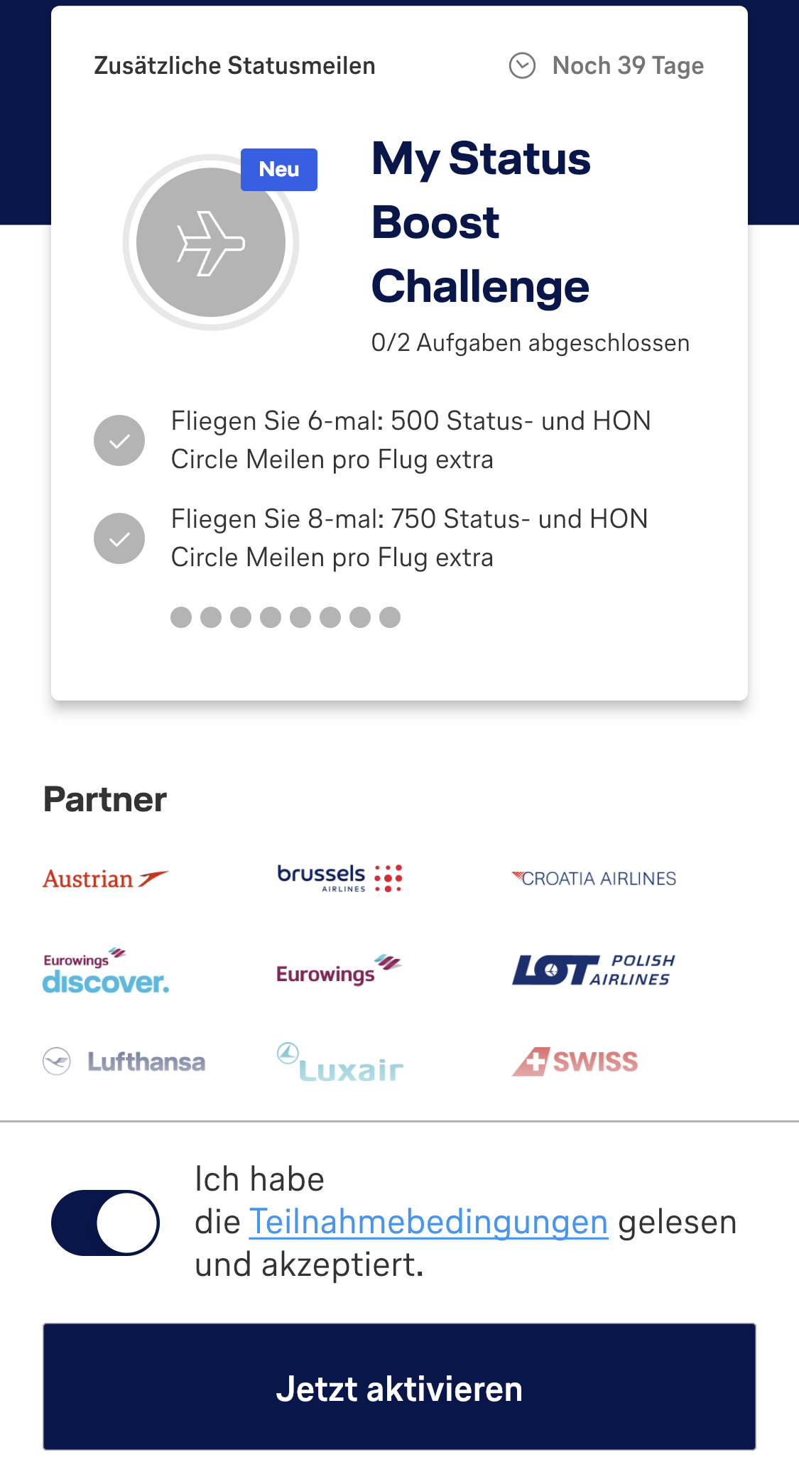 Berechtigten Personen wird die My Status Boost Challenge in der Miles & More App angezeigt. Hierfür empfehlen wir, die jeweils aktuellste Version der Miles & More App zu nutzen.