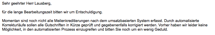 Was mir in diesem Schreiben völlig fehlt ist ein Zeitpunkt, wann man mit einer Lösung des Problems rechnen kann. Diese Mail ist inzwischen auch schon eine Woche alt. Was ich allerdings schon fast bedenklich finde ist, dass man den massiven Fehler bei Miles&More zwar einräumt, es aber nicht für nötig ansieht, sich in diesem Textbaustein auch hierfür zu entschuldigen.