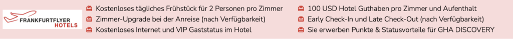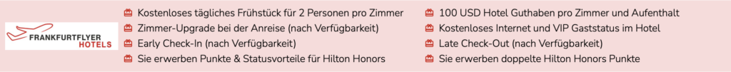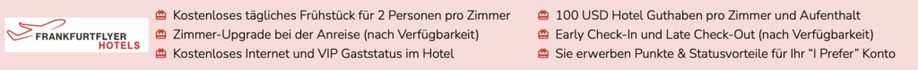 Diese Angebote bieten meist folgende Frankfurtflyer Vorteile, wobei sie je nach Hotel abweichen können. Die Auflistung dient mehr zur Orientierung und die genauen Details könnt Ihr bei der Buchung sehen oder auch bei uns erfragen.