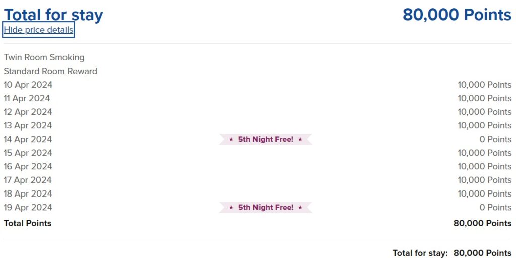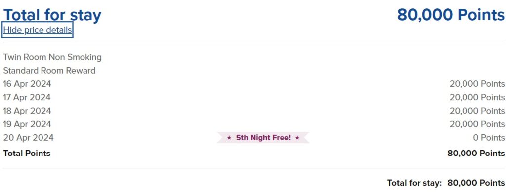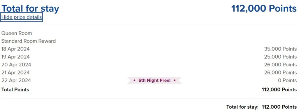 Der Vorteil bei dem Ihr für längere Aufenthalte mit Punkten belohnt werdet, ist der „Fifth Night Free“-Award. Bucht Ihr fünf aufeinanderfolgende Nächte mit Punkten, erhaltet Ihr die fünfte Nacht kostenlos. Das funktioniert nicht nur bei fünf Nächten, sondern auch bei einem Vielfachen davon. Ihr spart also im Idealfall 20% der Punkte.