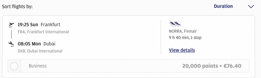 Ein weiterer großer Vorteil von Finnair Plus ist, dass man auf Flügen mit Finnair selbst keine Treibstoff- oder internationale Zuschläge an die Kunden weitergibt, sodass die Zuzahlungen sehr gering sind. Ein Flug von Frankfurt über Helsinki nach Dubai kostet somit in der Business Class aktuell nur 20.000 Punkte und 76,40 Euro.