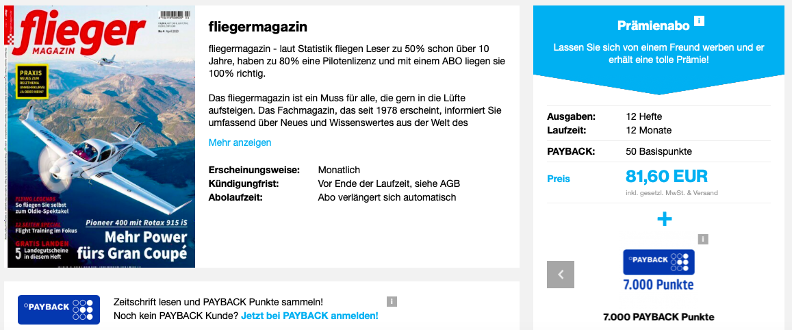 Um die volle Anzahl an Payback Punkten/ Miles&More Meilen zu bekommen, müsst Ihr bei dem Bestellen des Abos als Prämie die 7.000 Payback Punkte auswählen, welche zusammen mit den 50 Basispunkten eine Prämie von 10.060 Miles&More Meilen ergeben. Payback Punkte lassen sich einfach und schnell 1 zu 1 in Miles&More Meilen umwandeln.