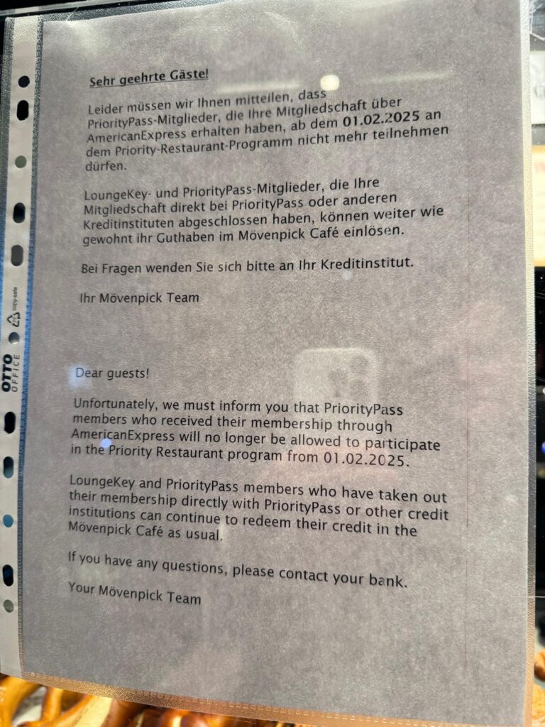Die Antwort ist zwar „ja“, wie wir jetzt wissen, doch eine positive Nachricht ist das trotzdem nicht. Denn alle Priority Pass Inhaber, die Ihre Mitgliedschaft über eine American Express Platinum Kreditkarte abgeschlossen haben, werden zukünftig ausgesperrt. Wie ein Infozettel des Mövenpick Cafés am Berliner Flughafen erklärt, werden ab dem 1. Februar 2025 nur noch Priority Pass Mitgliedskarten akzeptiert, die direkt bei dem Loungepass-Anbieter gekauft oder von anderen Kreditkartenanbietern ausgestellt wurden.