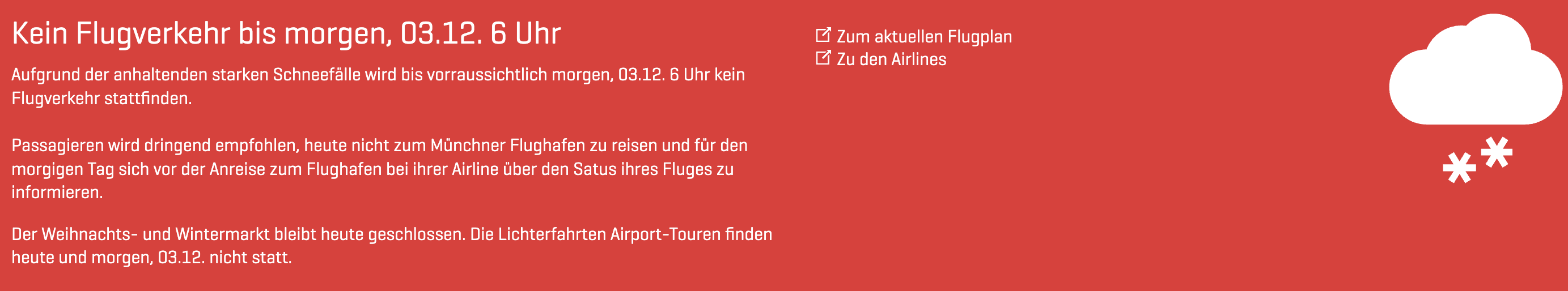 Aufgrund der anhaltenden starken Schneefälle wird bis morgen, 03.12. 6 Uhr kein Flugverkehr stattfinden. Wir empfehlen Ihnen dringend, sich bereits vor Ihrer Anreise zum Flughafen bei Ihrer Airline über den Status Ihres Fluges zu informieren. Der Weihnachts- und Wintermarkt bleibt heute geschlossen. Die Lichterfahrten Airport-Touren finden heute nicht statt.