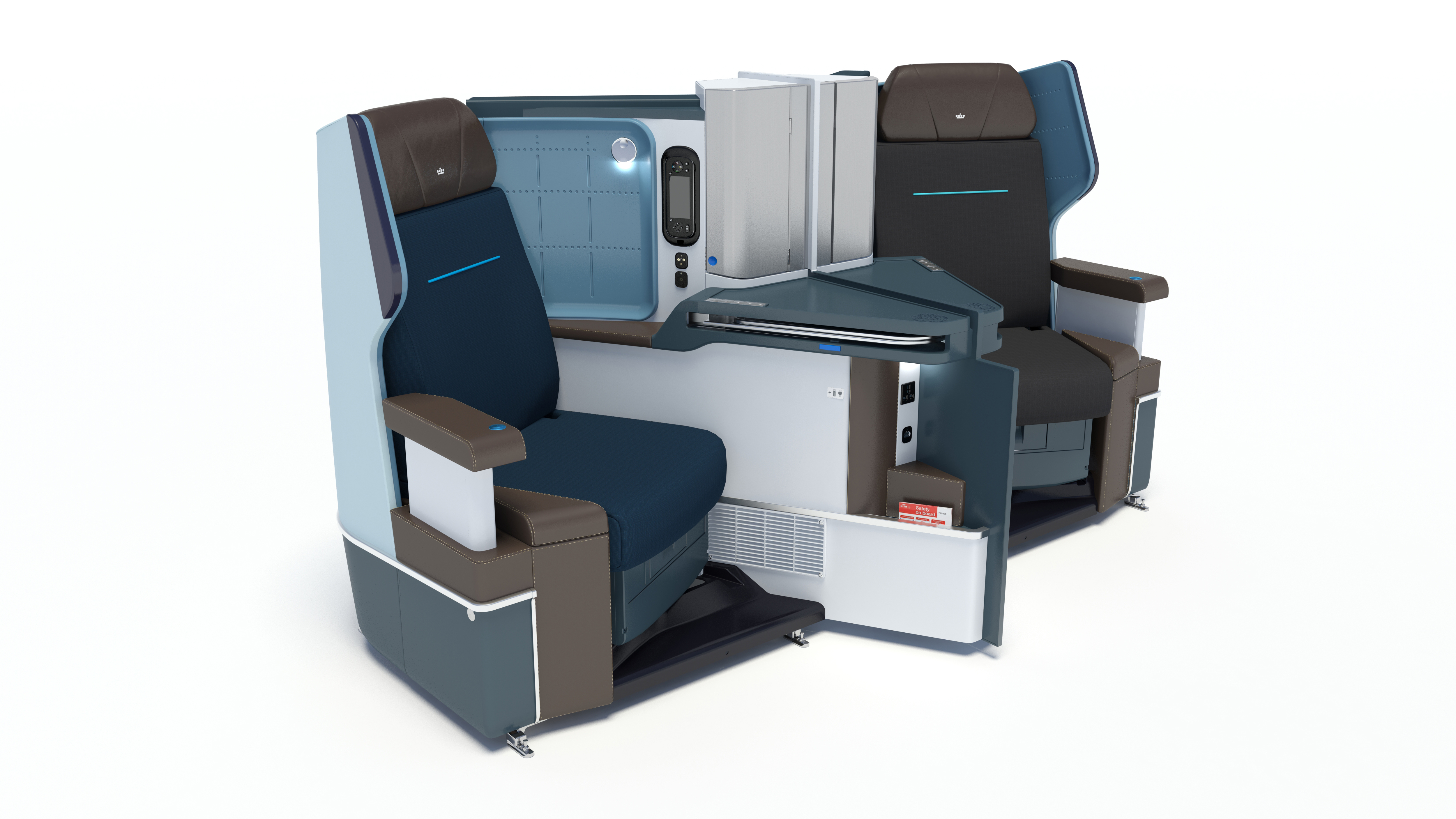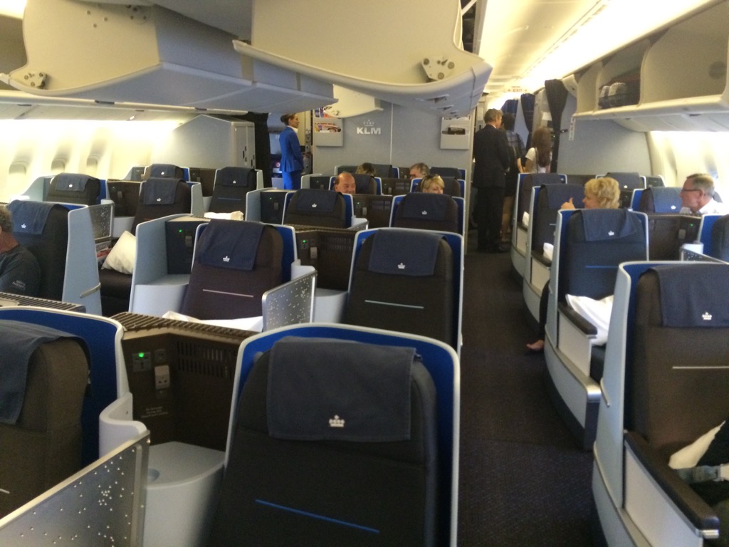 Auf den meisten Flugzeugen, wie der Boeing 777, Boeing 747 und dem Airbus A330, setzt KLM einen Business Class Sitz ein, welcher sich in ein komplett flaches Bett verstellen lässt und in einer 2-2-2 Anordnung verbaut ist.