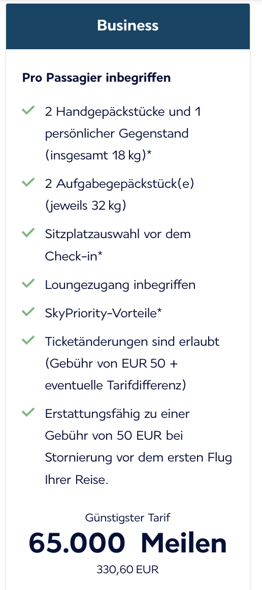Das Programm hat einige Vorteile, so sind Zubringer aus zahlreichen Regionen (u.a. alle deutschen Flughäfen) inklusive, der Reisezeitraum geht über mehrere Monate und erlaubt auch kurzfristige Buchungen sowie oneway-Trips. Highlights diesen Monat sind Flüge nach Boston oder Chicago, die oneway-Reisen in Economy gibt es schon ab 11.250 Meilen plus ca. 150-200€ Steuern inkl. Zubringer ab Deutschland. Ein Highlight in der Business Class ist u.a. Mexiko Stadt ab 60.000 Meilen und etwa 330€ Nebenkosten: