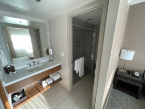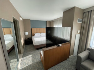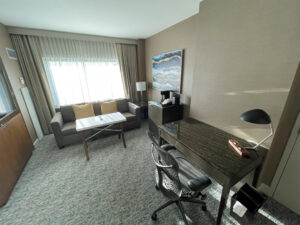 Das Hotel bietet insgesamt 316 Gästezimmer. Die Zimmer sind hier eher Suiten, denn es gibt einen Wohn- und einen Schlafbereich. Im Wohnbereich befinden sich ein Schreibtisch mit Stuhl sowie ein Wohnzimmertisch mit Sofa und Sessel. Der Fernseher, der drehbar auf einem Lowboard montiert ist, dient als optischer Raumtrenner. Je nachdem, wo man fernsehen möchte, kann man den Fernseher hindrehen. Die Fernbedienung muss man dann jeweils hin- und hertragen. Steckdosen und USB-Anschlüsse zum Laden von Elektrogeräten gibt es am Schreibtisch, an der Wohnzimmerlampe und auf den Nachttischen neben dem Bett. Hier findet sich auch ein Radiowecker.