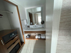 Der Check-In erfolgt an einem von bis zu vier Schaltern an der Rezeption. Als wir ankamen waren zwei geöffnet und die Wartezeit hielt sich in Grenzen. Von der Einreise in die USA und der Abholung des Mietwagens waren wir inzwischen abgehärtet und abgestumpft. Zum Check-In bekamen einige von uns gratis Wasser, die anderen erst auf Nachfrage.