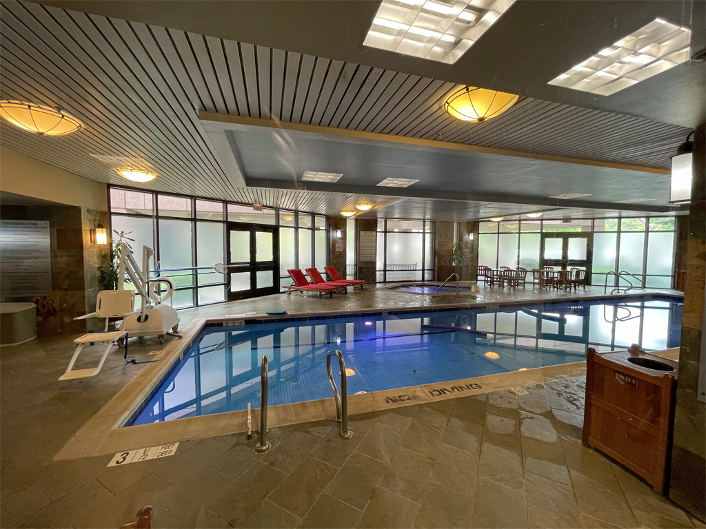 Durch das Fitnesscenter geht es in den Indoor Pool. Dieser ist recht schmal, aber lang genug zum Bahnschwimmen. Die Breite sollte ausreichen, dass man vorsichtig aneinander vorbeischwimmen kann.