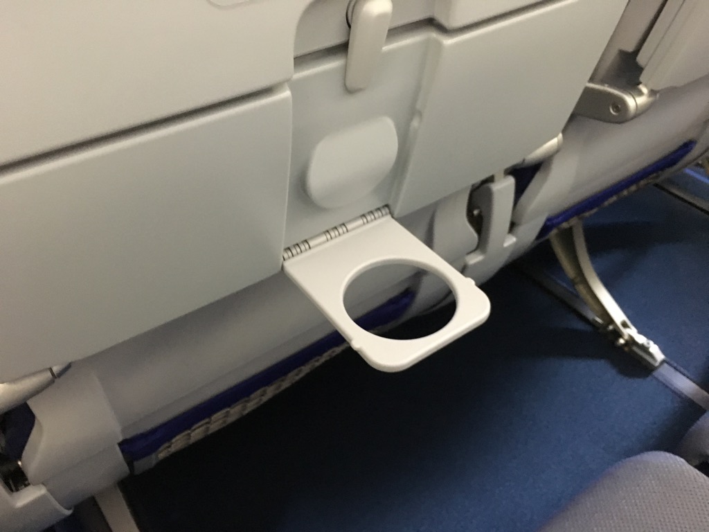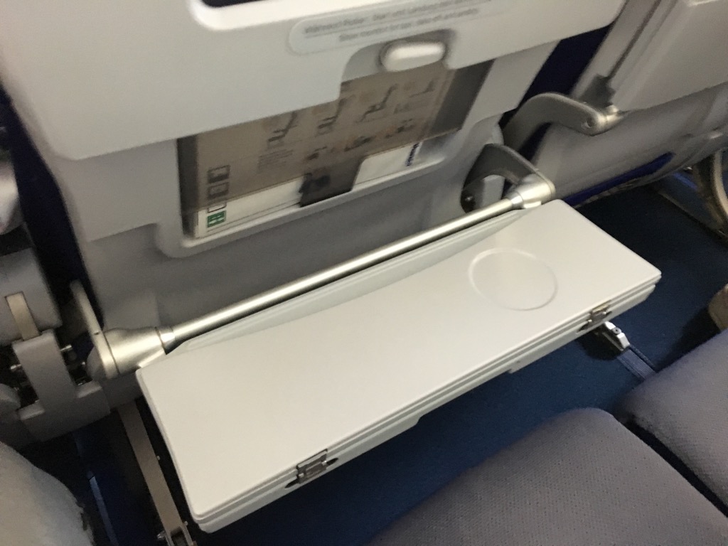Der Tisch am Vordersitz in der Lufthansa Economy Class ist in zwei Teile geteilt, sodass man ihn nicht immer komplett ausklappen muss, wenn man z.B. nur etwas trinkt. Zusätzlich gibt es noch einen sehr cleveren Getränkehalter.