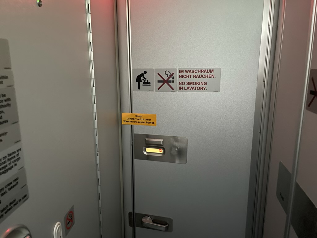 Ein wenig irritiert hat mich eine Toilette im hinteren Teil des Flugzeuges, welche ab Start als „Out of Service“ gekennzeichnet war. Ein befreundeter Flugbegleiter meinte zu mir, dass es vermutlich als „Crew Toilette“ verwendet wurde, was ich anhand des einseitig gelösten Siegels auch für wahrscheinlich halte.