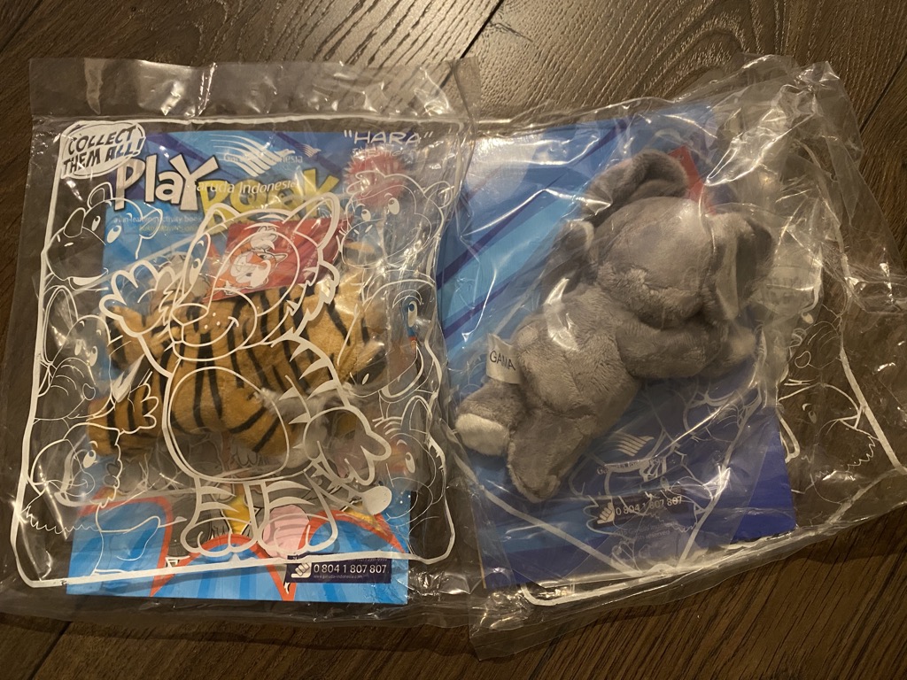 - Garuda Indonesia Spielzeug Tiger (99); Garuda Indonesia Spielzeug Elefant (100) je 5€