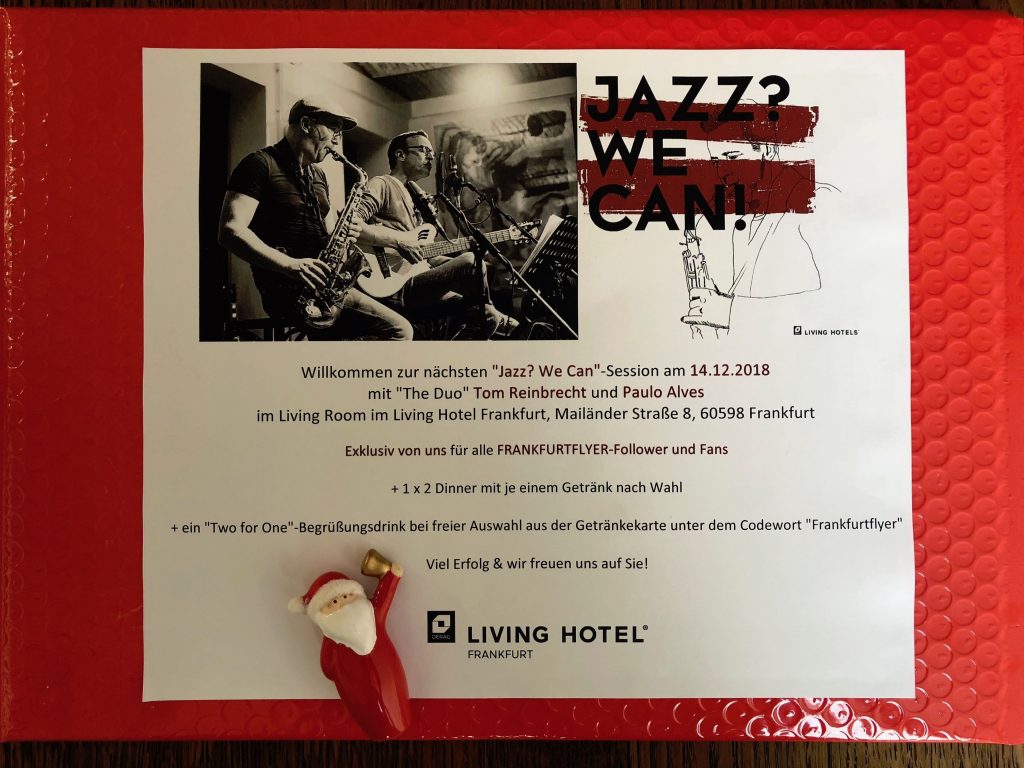 Das ist aber wie bereits erwähnt nicht alles, denn wie oben erwähnt können diesmal ALLE Frankfurtflyer.de Fans von dieser Aktion profitieren. So könnt Ihr kostenfrei am „Jazz? We can!“ Event am 14.12. teilnehmen und erhaltet mit dem Codewort „Frankfurtflyer“ zwei Begrüßungsgetränke Eurer Wahl zum Preis von einem.