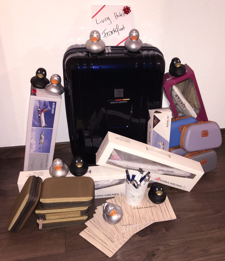 Und zum Abschluss wollen wir Euch einen kurzen Einblick in alle Gewinne geben. Zu bemerken gibt es, dass nicht alle Gewinne auf dem folgenden Bild vollständig abgebildet sind. Eventuell haben wir von manchen Dingen mehrere Exemplare, oder sogar noch Gewinne, die sich gar nicht auf dem Bild befinden. Wir wollen die Überraschung ja nicht gleich komplett vorweg nehmen. Viel Spaß bei der Teilnahme und viel Erfolg wünscht das Frankfurtflyer.de Team, bestehend aus Christoph, Tim, Frederic, Simon und Nicole.