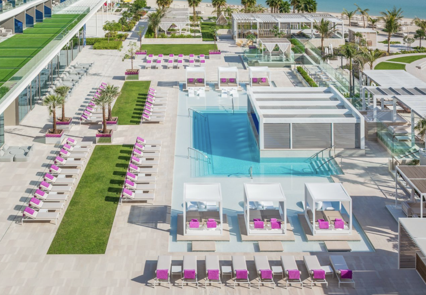 Zu den wichtigsten Highlights zählen die großzügigen Zimmer und Suiten, viele davon mit Meerblick oder Aussicht auf die Skyline von Dubai. Die Ausstattung ist hochwertig, trendig und detailverliebt – von gemütlichen Signature-Betten über stylische Badezimmer bis hin zu modernen Entertainment-Systemen. Wer Entspannung sucht, findet sie am weitläufigen Privatstrand oder am WET-Deck, dem ikonischen Poolbereich, der sowohl tagsüber als auch abends ein lebendiger Treffpunkt ist.