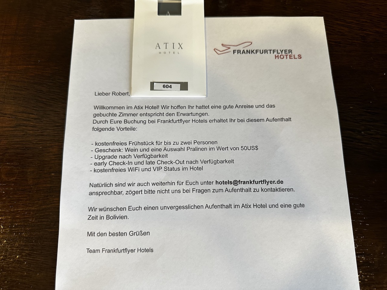 Wirklich nett war auch das persönliche Begrüßungsschreiben. Später kam dann auch noch das versprochene Geschenk vom Hotel in Form von Schokolade und Wein, wobei dies ehrlicherweise üppiger hätte ausfallen können.
