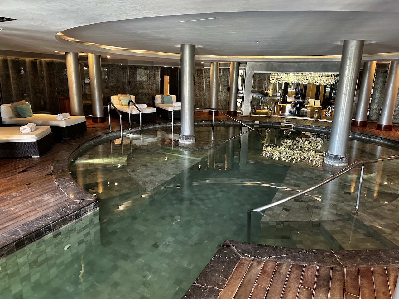 Im Untergeschoss ist der große Spa Bereich, hier findet man einen Pool, der auch einen Außenbereich bietet. Liegen stehen sowohl im Innen- als auch im Außenbereich, die hohen Hecken geben etwas Ruhe und Privatsphäre.
