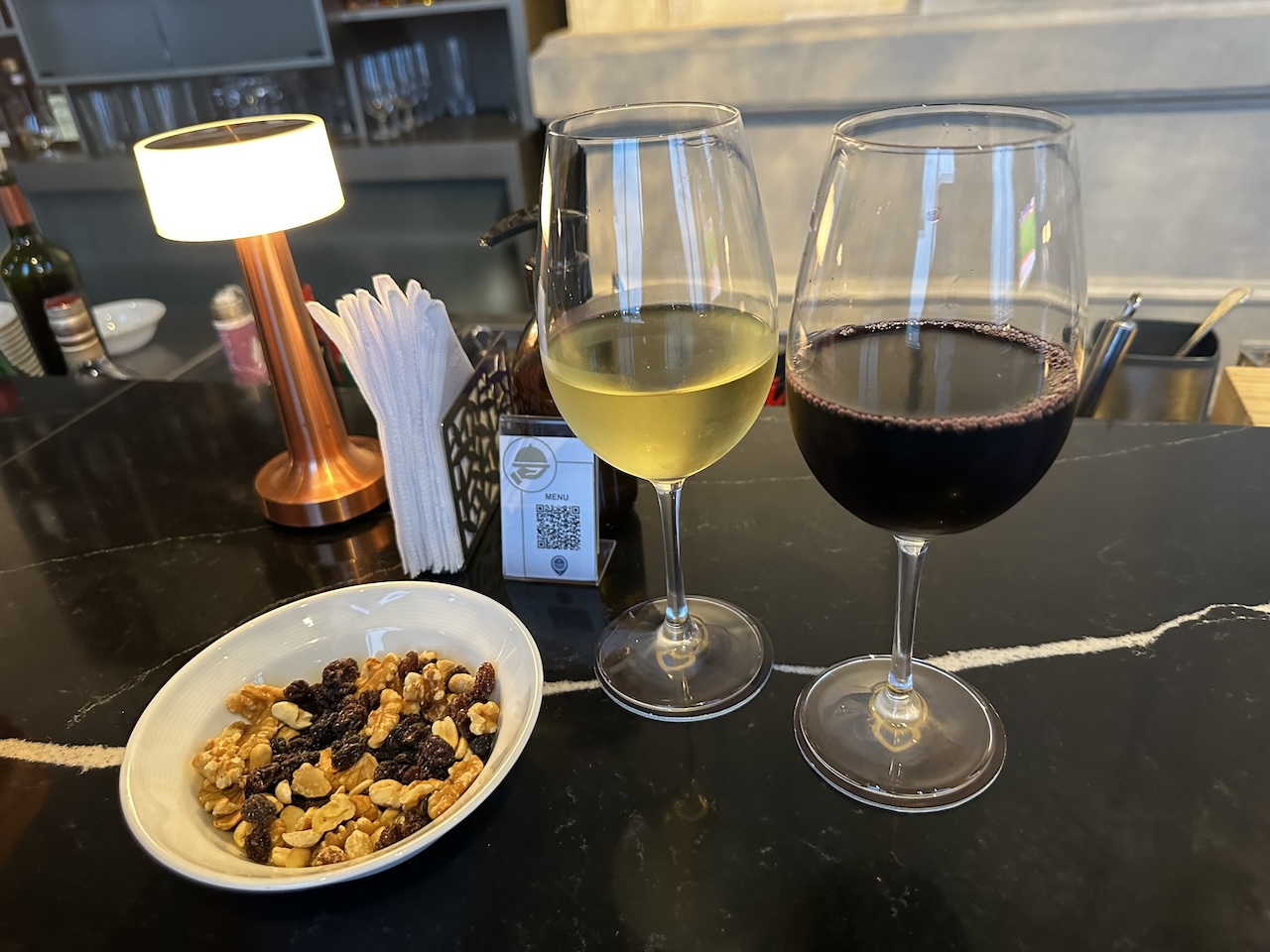 An der Bar lösten wir unser Willkommensgetränk ein, wir konnten Wein, Bier oder Softdrinks wählen. Im Angebot waren sechs verschiedene Tropfen, dazu gab es Nüsse und etwas Smalltalk mit dem netten Bartender.