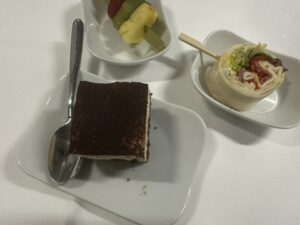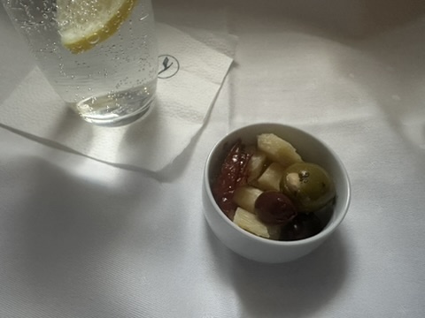 Dazu werden schon beim Boarding Nüsse gereicht, die gab es bisher erst nach dem Start zu Aperitif. Diese erste Getränkerunde gibt es nach wie vor, dazu wurde jetzt ein „Gruß aus der Küche“ gereicht. Der Snack soll immer vegetarisch sein, als Amuse Bouche wurden in der Pressemeldung u.a. Antipasti und Sushi angekündigt. Wir hatten einmal auch einen aufgeschnittenen Wrap.