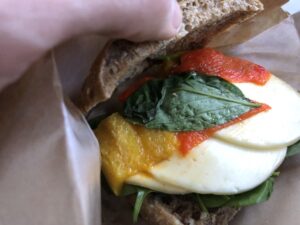 Hierbei handelt es sich um ein Mozzarella Grillgemüse Sandwich. Optisch und geschmacklich nichts Besonderes, beim Brot könnte etwas Abwechslung nicht schaden. Alternativ wird das Chicken Hummus Sandwich offeriert.
