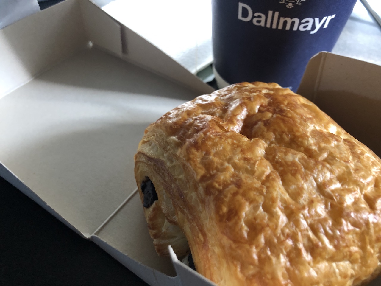 Für hungrigere Passagiere gibt es die Lachs-Avocado Bowl oder einen Caesar Salad. Das Sortiment soll es ganztags geben, auf dem ersten Flug des Tages nach Deutschland sind jedoch alle oben genannten Speisen nicht erhältlich. Die Auswahl beschränkt sich dann auf ein Müsli oder ein Schokoladencroissant. Dieses ist aber nicht aufregend, könnte warm jedoch ganz gut schmecken. An Bord wird es aber kalt serviert und kostet 2,50€.