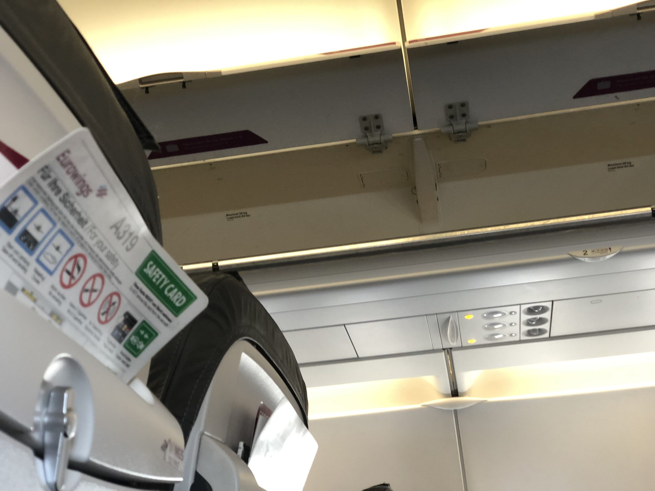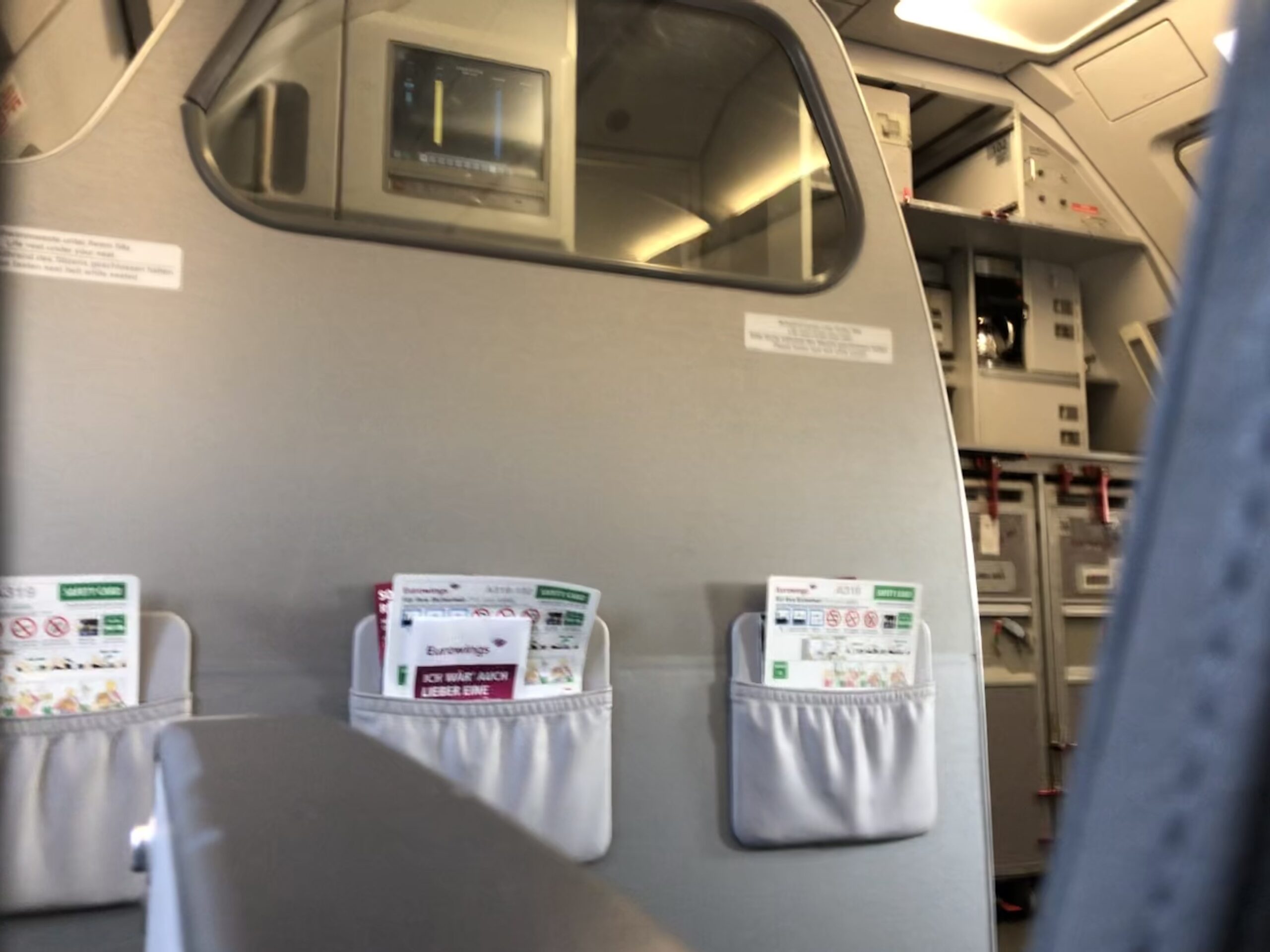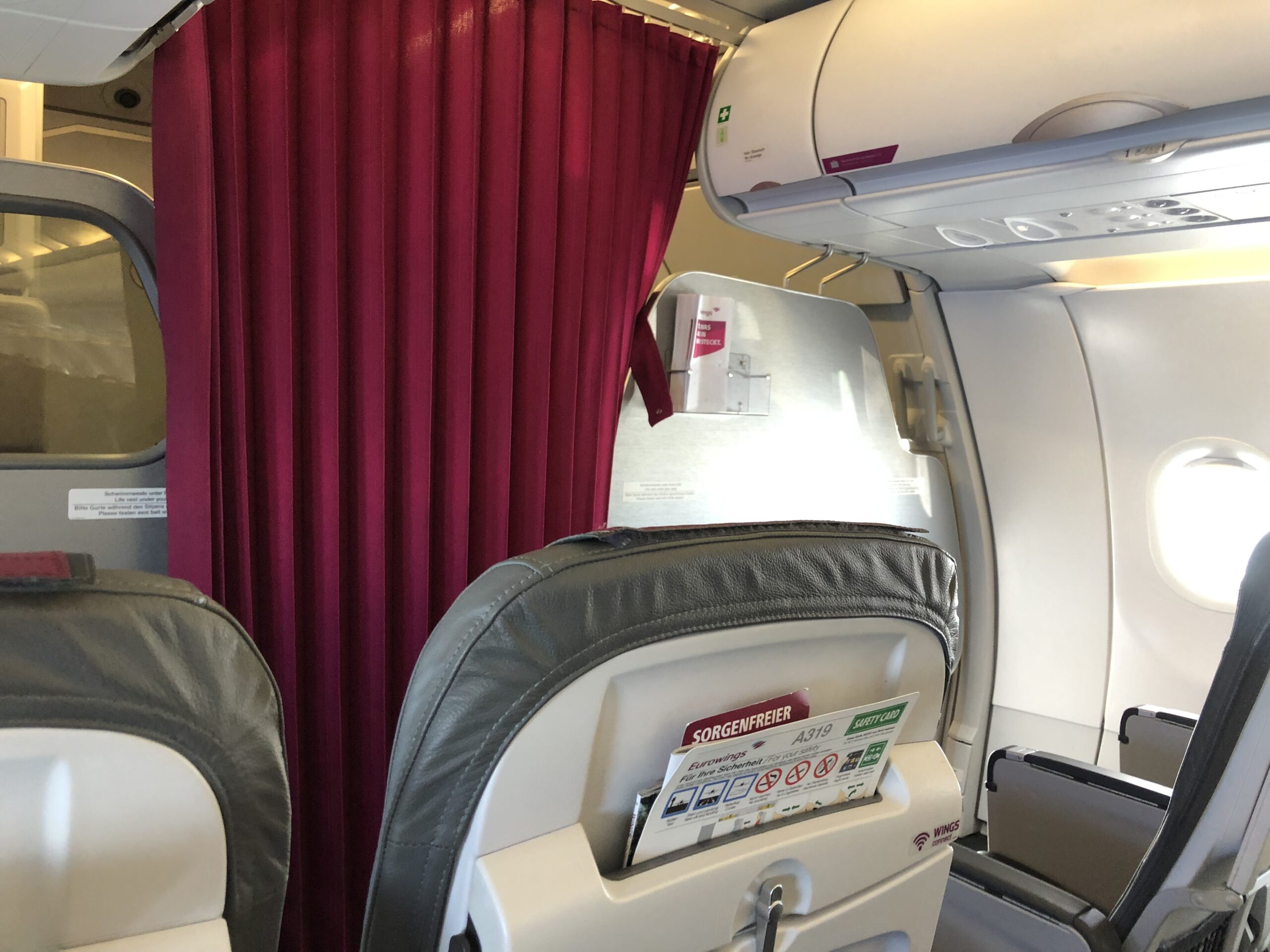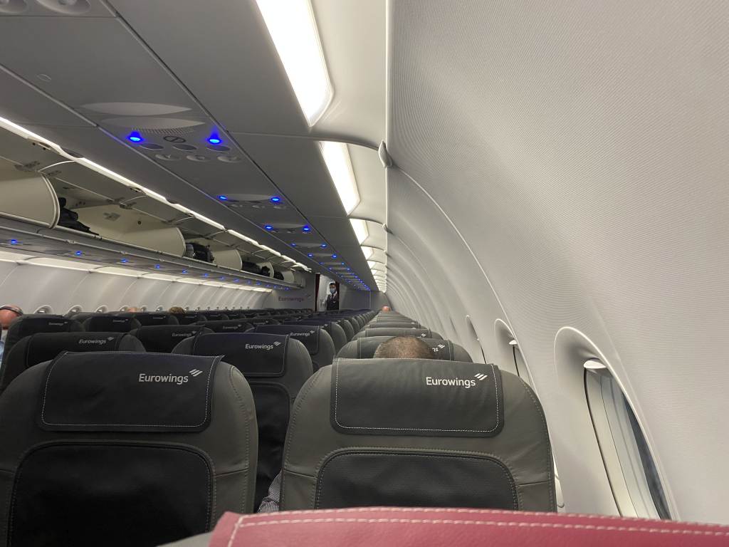 Ungefähr so wie auf dem Bild sieht es auch tatsächlich in der Kabine aus, das Fehlen des Vorhangs fand ich etwas ungewohnt. Die Maschine füllte sich, bei Boarding completed war ich der Einzige in der ersten drei Reihen, danach waren die Sitze bis zum Notausgang voll besetzt. Hier ein Eindruck aus einem Beitrag von Sebastian, der einen Eurowings-Flug am Notausgang gereviewt hat.
