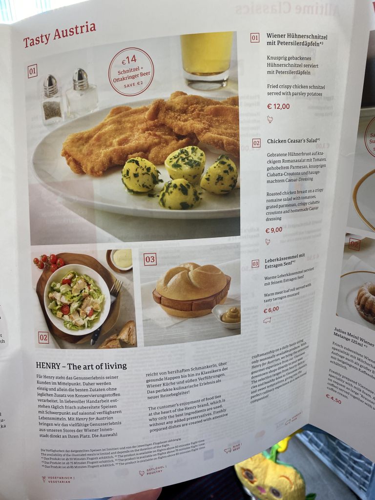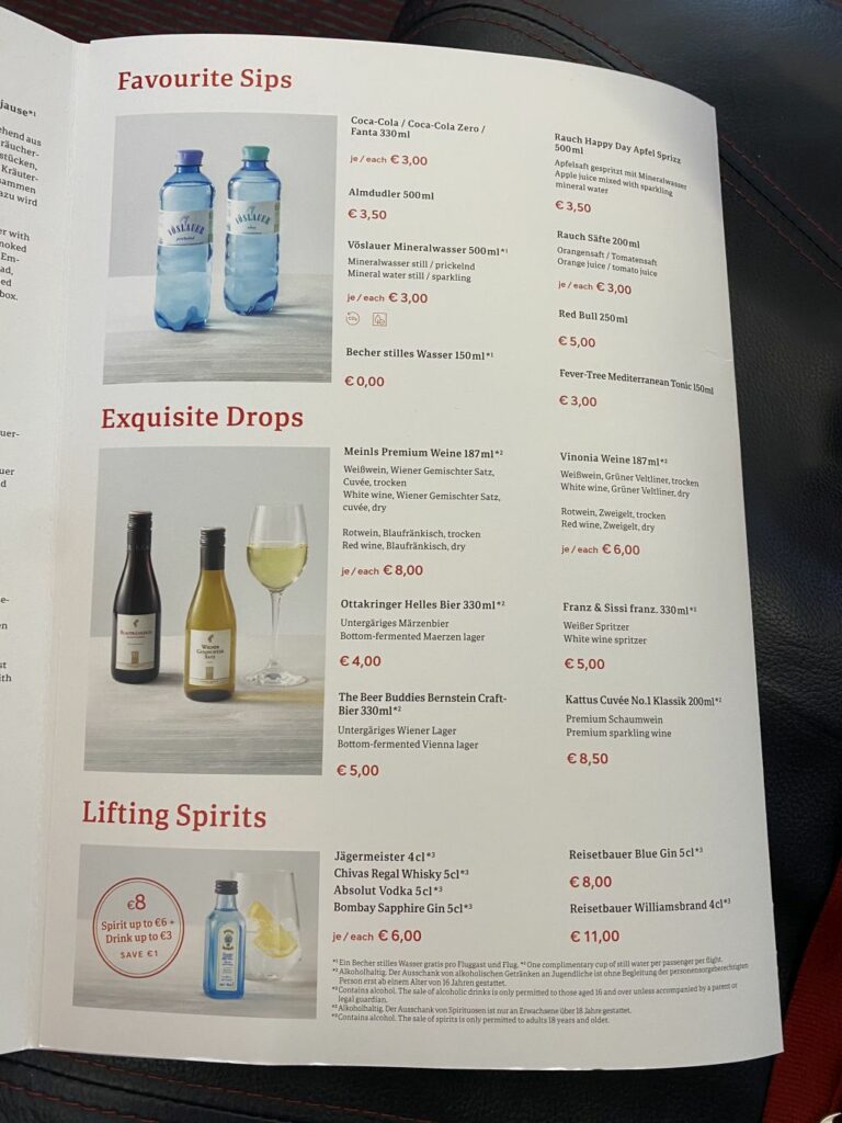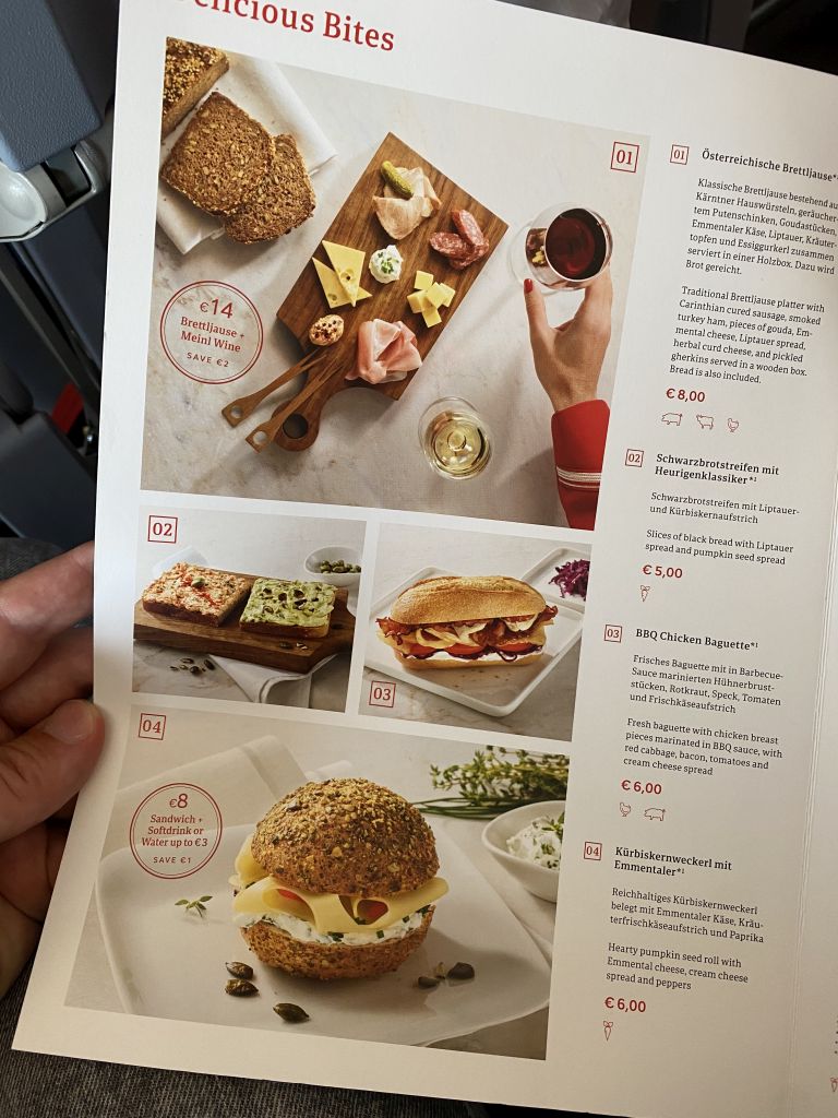 Die Menükarte des Austrian Airlines „buy on board“-Angebotes ist ziemlich umfangreich. Und, wie wir finden, auch dann alltagstauglich wenn man kein Hipster ist, der sonst in einem Cafe in Berlin seinen Soja-Latte schlürft.