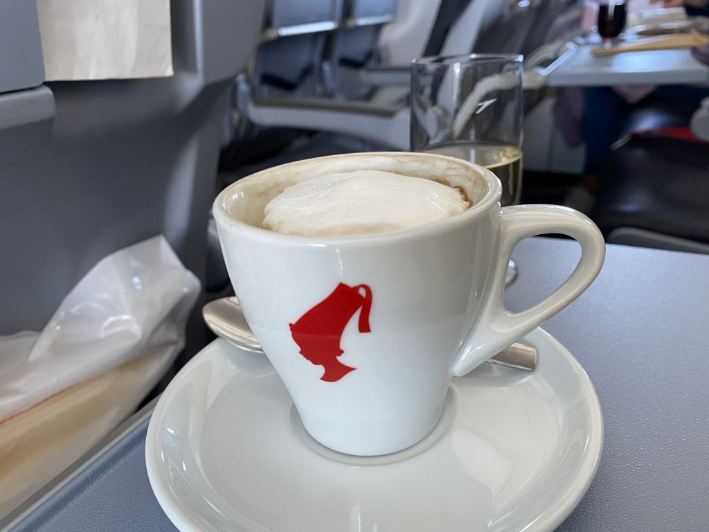 Während des Serviervorgangs erklärte die Flugbegleiterin sympathisch, dass sie sich mit dem Milchschaum richtig viel Mühe gegeben habe. Und so sah es auch aus. Wir nutzten die Situation für einen kurzen Austausch und ich fragte, ob die Zubereitung den herausfordernd sei. Sie erklärte dabei, dass man zur Zubereitung des Kaffees an sich eine Handkaffeemaschine nutze.