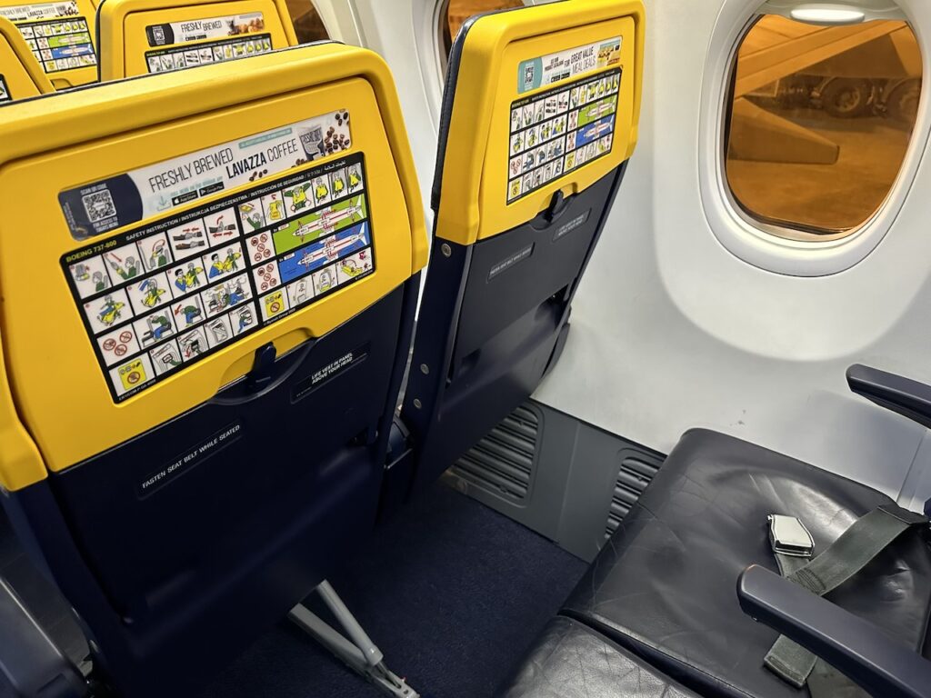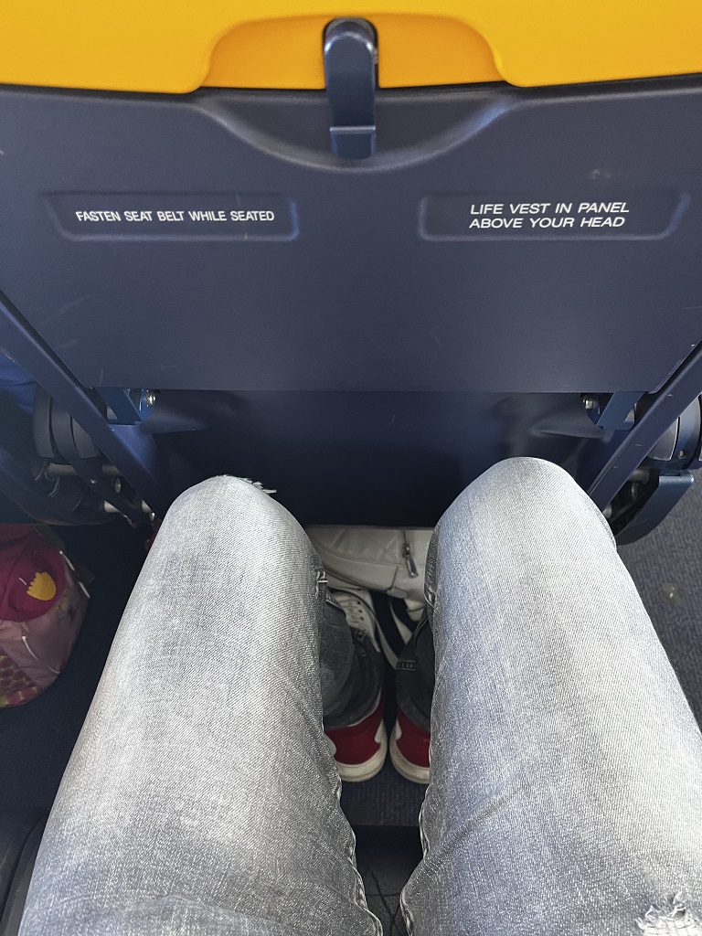 Nach einigen Ryanair-Flügen in den vergangenen Monaten wurde der Unterschied beim Hinsetzen dann doch deutlich. Dank der schlanken Sitze und fehlenden Sitztasche fühlt sich die Beinfreiheit bei Ryanair meist recht komfortabel für Menschen durchschnittlicher Größe an. Auf Sitz 27C in der Boeing 737-MAX-200 merkte ich schon, dass es etwas enger ist. Aber gefühlt so, als wäre der Sitz genau für Menschen mit meiner Statur gebaut. Auch bei entspannter Sitzposition drückten meine Knie nicht gegen den Vordersitz. Das habe ich bei anderen Airlines schon anders erlebt.
