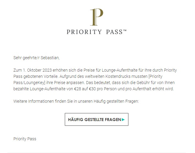 Die letzte Preiserhöhung bei Priority Pass liegt einige Jahre zurück. Doch nun hat der Lounge-Pass-Anbieter seine Kunden per E-Mail informiert, dass die Gebühren für Aufenthalte um zwei Euro steigen. Statt bisher 28 Euro bezahlt Ihr für den Lounge-Besuch zukünftig 30 Euro. Alternativ werden 24 GBP oder 35 USD pro Besuch in Rechnung gestellt.