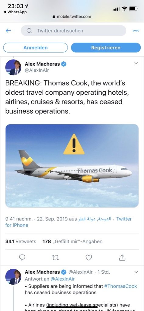 Die letzten Wochen wurde bereits gemutmaßt, dass Thomas Cook bald Insolvenz anmeldet. In den letzten Tagen haben sich die Lage und die Gerüchte zugespitzt. Heute Abend kam dann der Kracher über Twitter. Der Fluganalyst Alex Macheras, welcher beim britischen Sender BBC Experte für die Airlinebranche ist twitterte, dass Thomas Cook morgen seinen Betrieb einstellen wird.