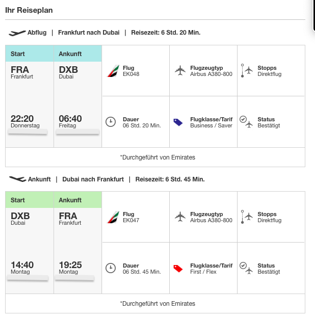 • Hinflug: Emirates Business Class Saver Tarif: 2x 45.000 Meilen (als oneway müsste man 62.500 Meilen im Business FlexPlus Tarif bezahlen)