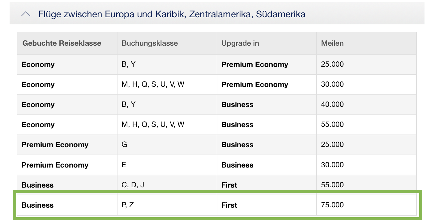 Die Antwort war ja, denn seit kurzem lassen sich für einen etwas erhöhten Meilenwert auch Business Flüge in Buchungsklasse P in First upgraden. Gesagt getan prüften wir auf Miles and More die Awardverfügbarkeiten für die First – denn ist ein Award auf Miles and More in First buchbar, lässt sich dieser auch ohne weiteres upgraden.