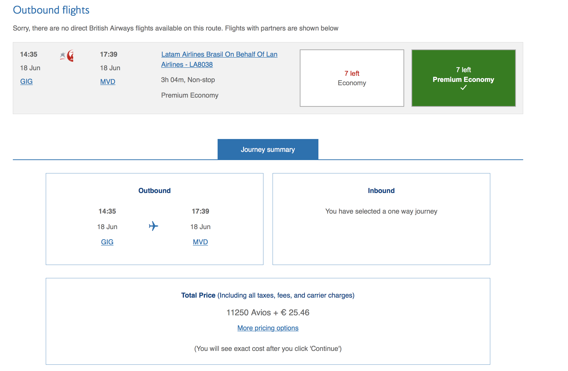 Nun mussten wir noch Lücken schließen um ein passendes Flugpaket zu haben. Da in Südamerika insbesondere internationale Flüge extrem teuer sind, prüften wir insbesondere Möglichkeiten mit LATAM und entdeckten dabei noch die Möglichkeit das Hauptziel der Reise nach Uruguay zu verlagern – für 12.500 Avios und 26,- Euro Steuern buchten wir die Premium Economy von Rio de Janeiro nach Montevideo – prinzipiell dürfte das Produkt einer europäischen Business Class sehr ähnlich sein. Economy wäre für 7.500 Avios verfügbar gewesen – den kleinen Aufpreis zahlen wir gerne.
