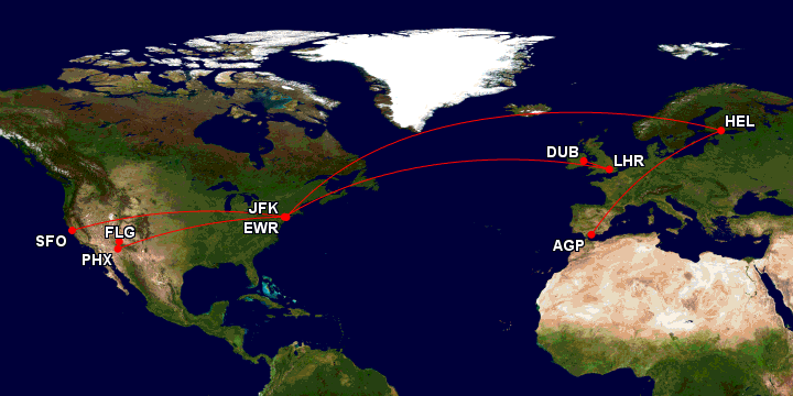 Vor Ort geht es dann erstmal mit dem Mietwagen durch die Landschaft, beim Rückflug durfte es also ein anderer Abflughafen sein. Hier hatte ich dann günstige Optionen ab San Francisco gesehen, bei American Airlines (bzw. Google Flights oder die Matrix) konnte ich sogar einen Flug von dort nach Helsinki finden, der über New York geht und wieder zwei Mal die 140 TP bringt. Da der Trip dann in Spanien enden muss, war Malaga der Favorit. Der Flug zählt ja als Langstrecke und wird manchmal zweimal täglich direkt von Finnair angeflogen. Herausgekommen ist also nun dieser „doppelte Gabelflug“: