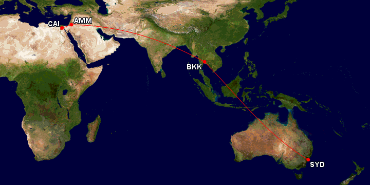 Nun konnte ich doch noch zuschlagen und habe einen oneway-Flug von Kairo nach Sydney gebucht- dabei geht es mit Royal Jordanian über Amman nach Bangkok und dann mit Qantas weiter nach Australien. Kairo ist zwar nicht der ideale Startflughafen für mich, der Preis liegt aber bei nur 1.100€ p.P. in der Business Class. Die Buchung erfolgte bei Kayak, der Tarif ist sogar stornierbar.