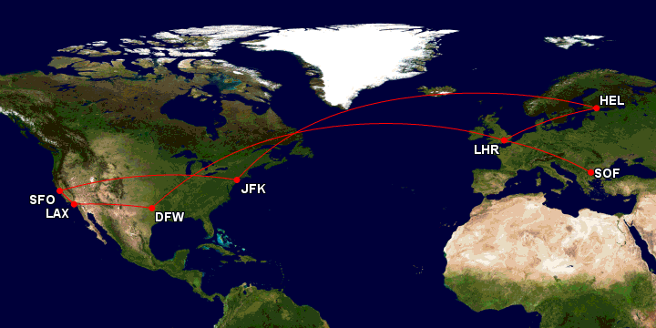 Auch Helsinki ist so weit von London entfernt, dass es die erhöhte Gutschrift gibt. Daher habe ich versucht eine Wegstrecke aus Sofia sowohl über UK als auch über Finnland zu führen. Dies war an vielen Terminen machbar, die Preise haben sich durch die veränderten Steuern und Gebühren meist nur leicht erhöht. Das erste Teilstück wird also SOF-LHR-HEL-JFK mit Übernachtung in Helsinki sein. Teilweise kann man auch längere Stopover einbauen, dauern diese länger als 24 Stunden, so steigt der Preis.
