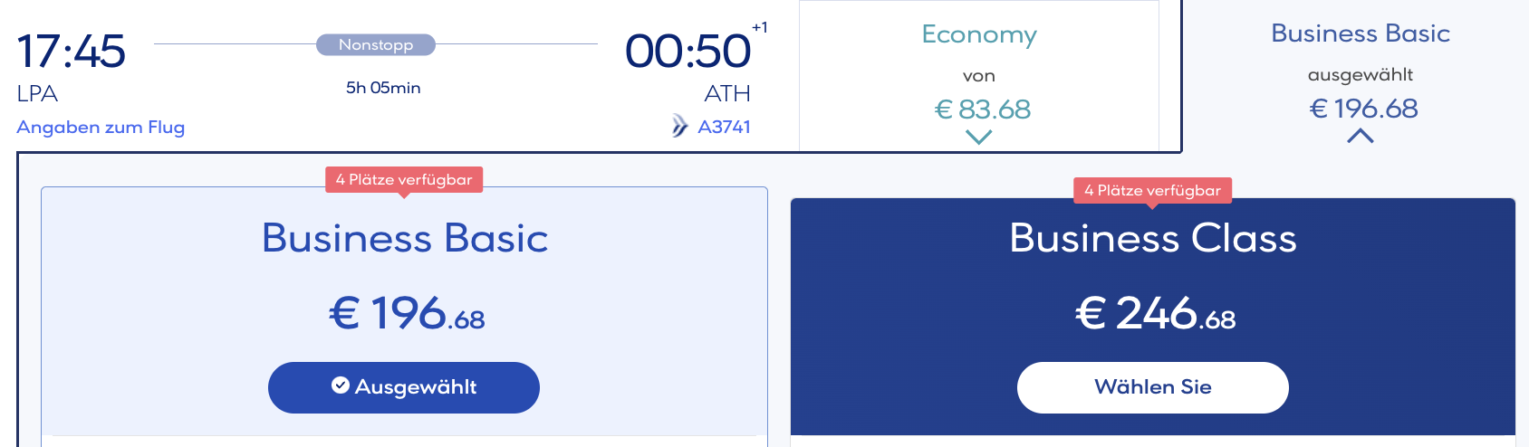 Ab dem Februar 2025 geht es dann auf die Kanarischen Inseln, Las Palmas wird dann jede Woche zwei Mal bedient. Hier fallen die günstigen Tarife in der Business Class auf, oneways gibt es stellenweise schon für unter 200€. Wer sich für den Business Flex Tarif entscheidet, muss für einen Roundtrip von und nach Athen etwa 510€ bezahlen, Mitglieder von dem Miles+Bonus Programm erhalten alleine dadurch schon über 10.100 Meilen gutgeschrieben.