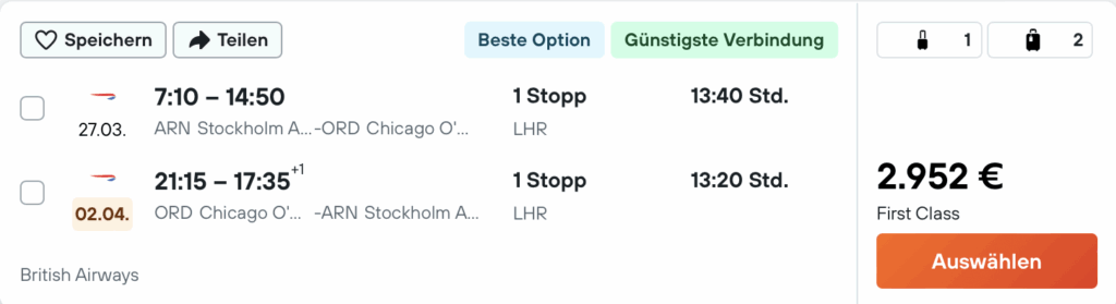 Günstige First Class Flüge in die USA sind sehr selten geworden, aber British Airways hat hier gerade ein Angebot ab Stockholm aufgelegt, mit welchem man ab 2.952 Euro den Hin- und Rückflug über London nach Chicago buchen kann. Gerade für oneworld Fans ist dies sicher ein spannendes Angebot, denn die Preise sind hier in der First Class attraktiver, als in der Business Class ab anderen Startorten.