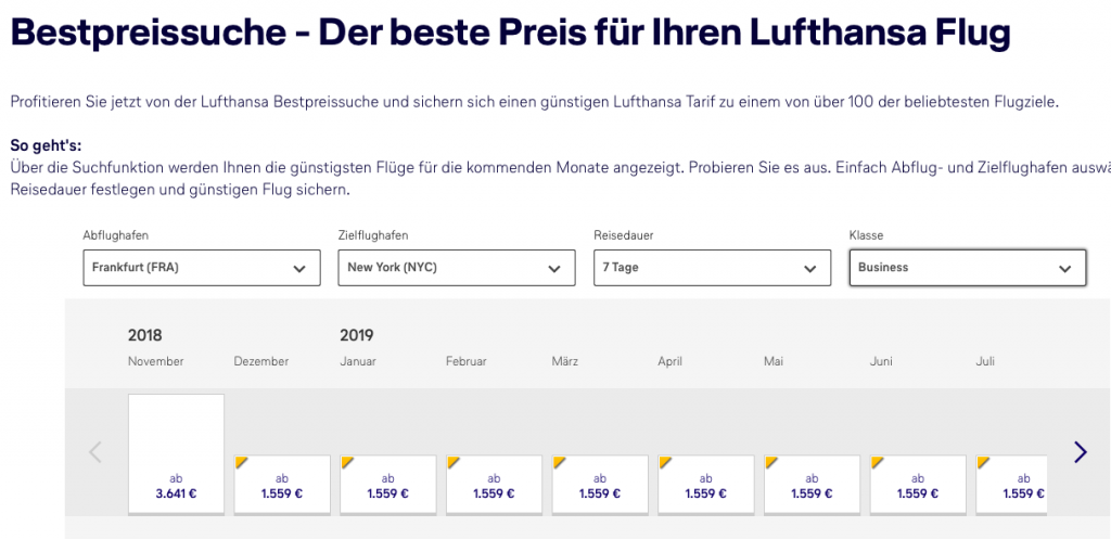 Die Funktion der Lufthansa Bestpreissuche ist sehr intuitiv und schnell erklärt. Hierfür gebt Ihr einfach den gewünschten Startflughafen, Zielflughafen, Reiseklasse und Reisedauer in die Suchmaske ein. Ihr bekommt gleich für alle kommenden Monate die günstigsten verfügbaren Preise angezeigt.