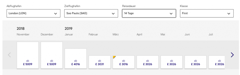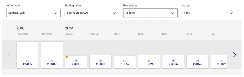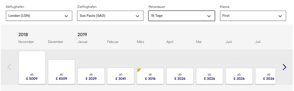 Stellt man allerdings die Reisedauer auf 12 Tage oder 15 Tage, sprich verschiebt die Urlaubsdauer ein wenig, dann findet man Flugpreise ab 3.010 GBP für den Hin- und Rückflug in der Lufthansa First Class.