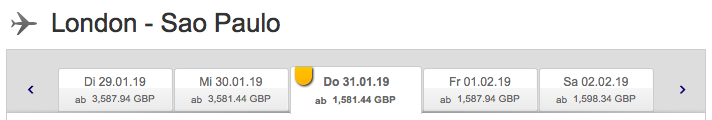 Man sucht First Class Flüge von London nach Sao Paulo, für welche es verhältnismäßig günstige Tarife gibt. Hierbei will man etwa 14 Tage im Januar verreisen.