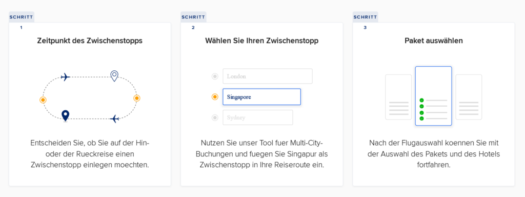Wenn Ihr das Stopover Programm buchen wollt, müsst Ihr bei der Flugbuchung einen Stopover in Singapur einplanen. Bei Singapore Airlines wählt Ihr dazu eine Multistop-Buchung. Der Stopover kann dabei lediglich in einer Richtung in Anspruch genommen werden. Soll auf dem Rückflug ebenfalls ein Stopover in Singapur eingelegt werden, verlangt Singapore Airlines zumeist einen Tarifaufschlag.