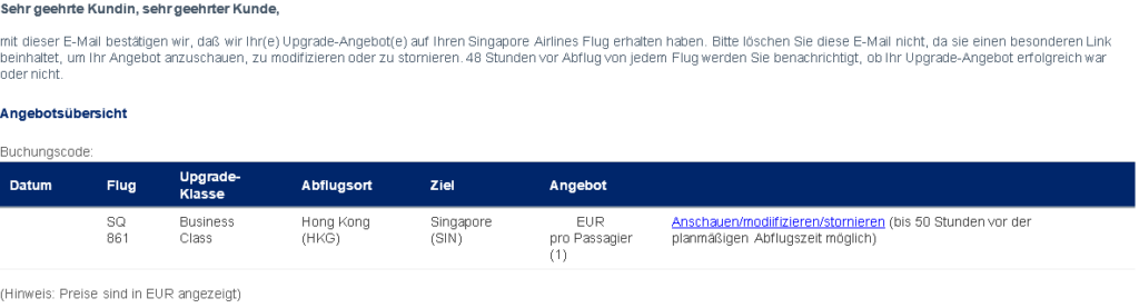 Ein Beispiel: Für die Strecke Singapur Frankfurt berechnet Singapore Airlines ca. 12,5 Stunden Flugzeit. Mein Mindestgebot für ein Upgrade lag dann bei ca. 690 SGD (ca. 460 EUR).