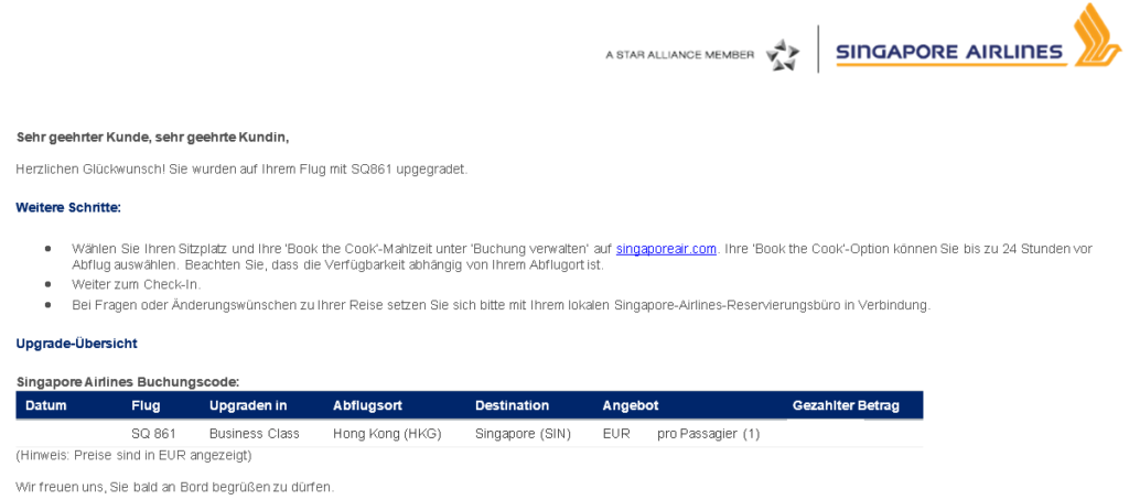 Ob das Upgrade erfolgreich war, erfahrt ihr ca. 40 Stunden vor Abflug.
